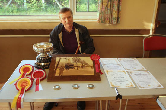![]() Alan with his award winning marquetry picture plus the Rosebowl Cup, medals, rosettes and certificates (As seen in our room at the Redbridge Social Centre) |