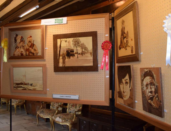 ![]() Section from the Beginner's Class display at Ingatestone Hall featuring Barry's two award winning marquetry pictures |